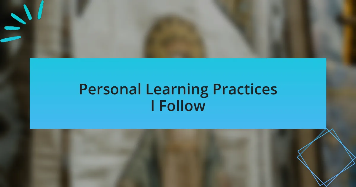 Personal learning practices I follow often involve setting aside dedicated time each week for self-reflection. I take a moment to jot down what I’ve learned and how it applies to my work. Have you ever noticed how reflecting on your experiences not only solidifies what you’ve learned but also opens doors to new ideas? I find this practice transforms my understanding, often revealing connections I hadn’t noticed before.